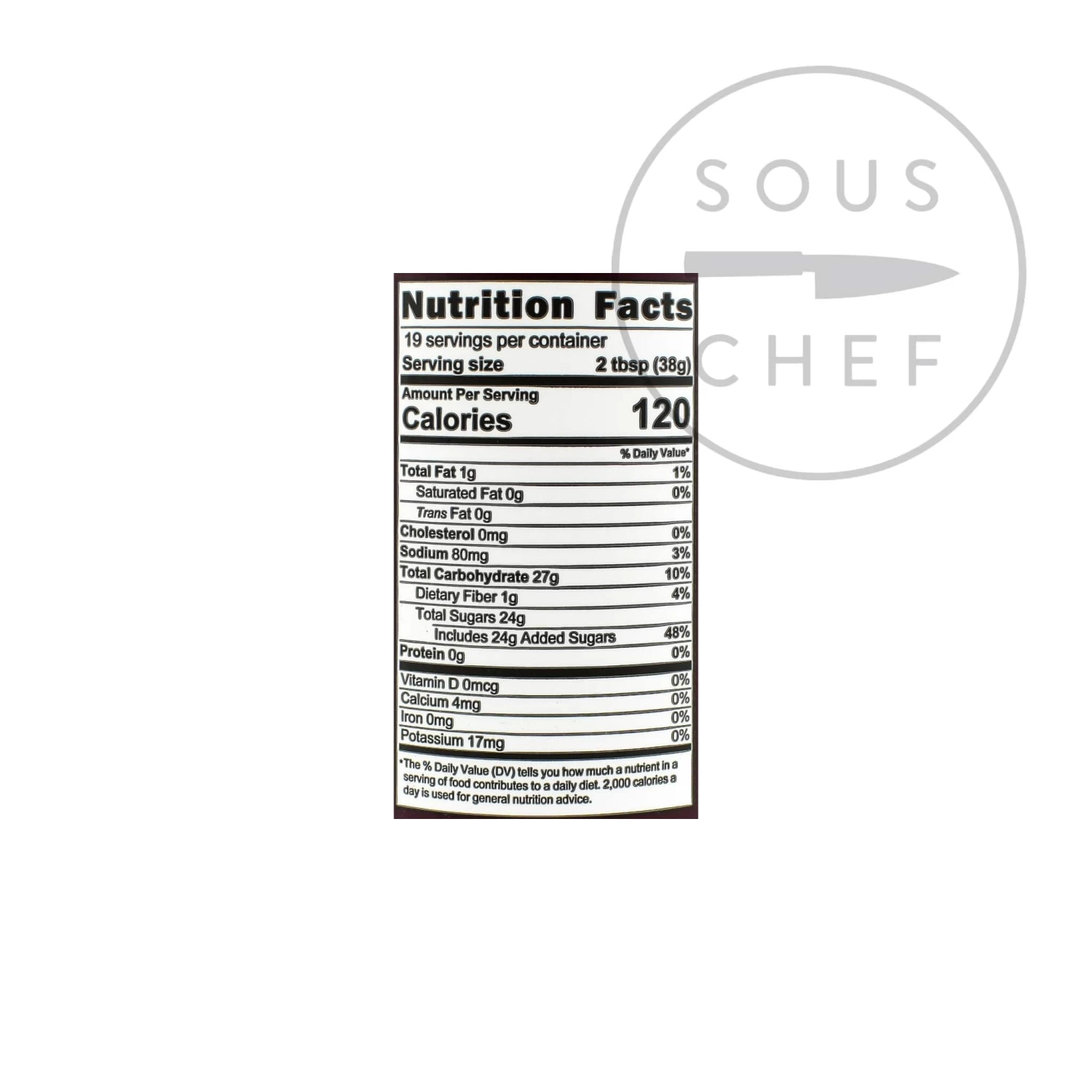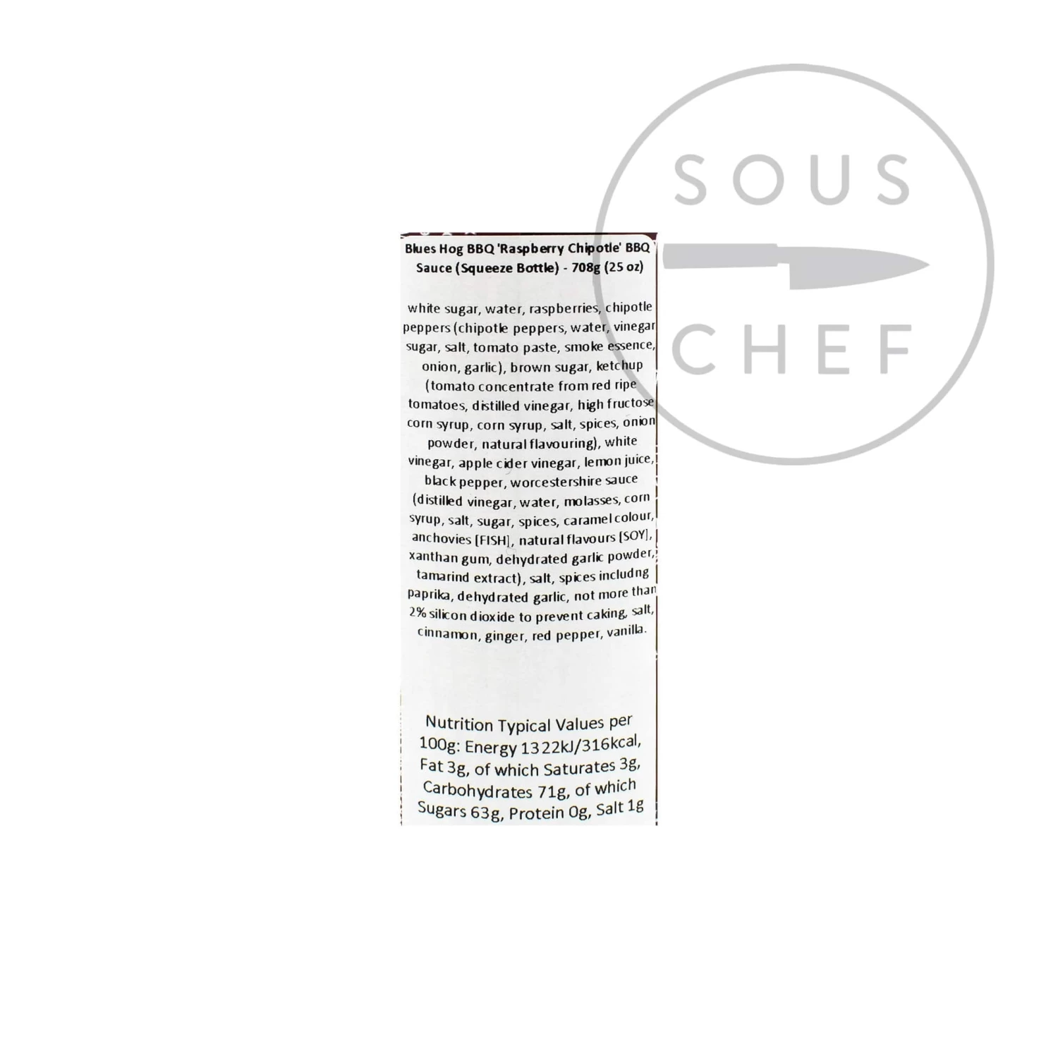 Ingredients: White sugar, water, raspberries, chipotle peppers (chipotle peppers, water, vinegar, sugar, salt, tomato paste, smoke essence, onion, garlic), brown sugar, ketchup (tomato concentrate from red ripe tomatoes, distilled vinegar, high fructose corn syrup, corn syrup, salt, spice, onion powder, natural flavouring), white vinegar, apple cider vinegar, lemon juice, black pepper, worcestershire sauce (distilled vinegar, water, molasses, corn syrup, salt, sugar, spices, caramel colour, anchovies [fish], natural flavours [soy], xanthan gum, dehydrated garlic powder, not more than 2% silicon dioxide to prevent caking, salt, cinnamon, red pepper, vanilla.