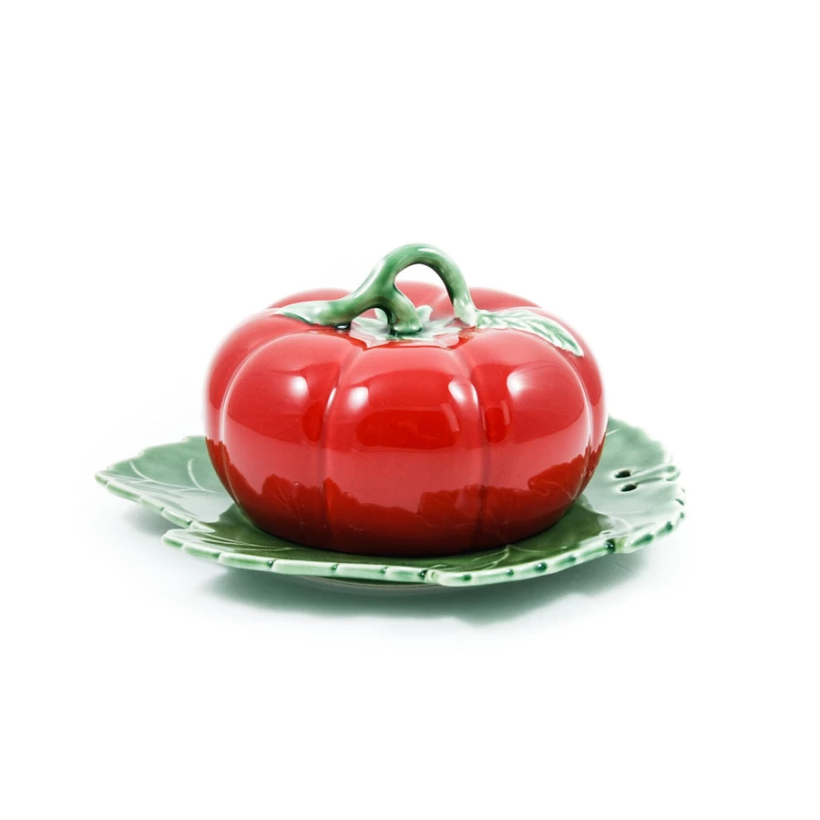 The earthenware butter dish from the highly collectible Portuguese ceramics studio, Bordallo Pinheiro. It is hand-painted to resemble a realistic tomato and leaf.