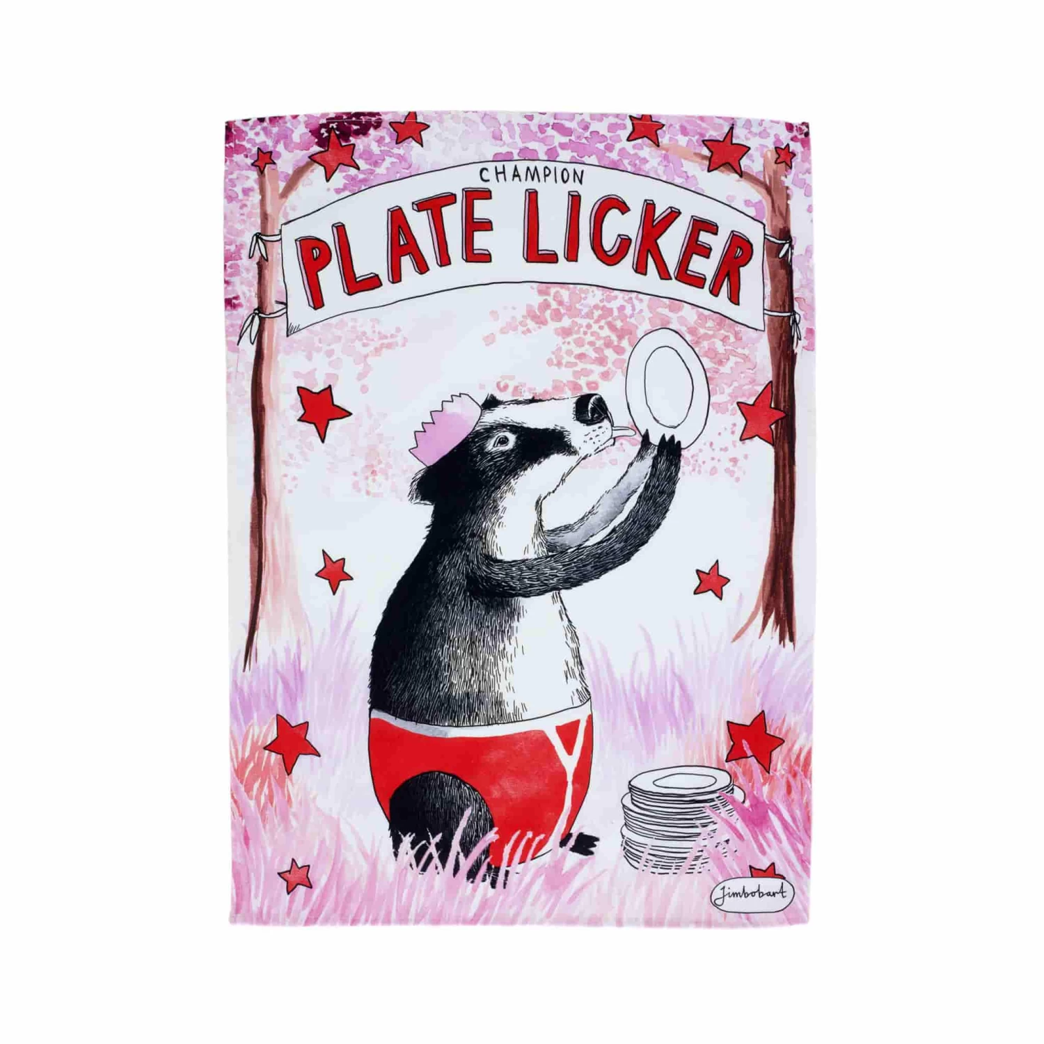 Jimbobart’s champion plate licker tea towel adds a playful touch to the kitchen chores. Made from 100% organic cotton and digitally printed in vibrant hues of pink and red, this tea towel dries dishes with ease and looks charming hanging by the sink. Decorated with a cheeky badger who prefers licking the plates to washing them, this kitchen furnishing will add a pop of colour to every space.Â