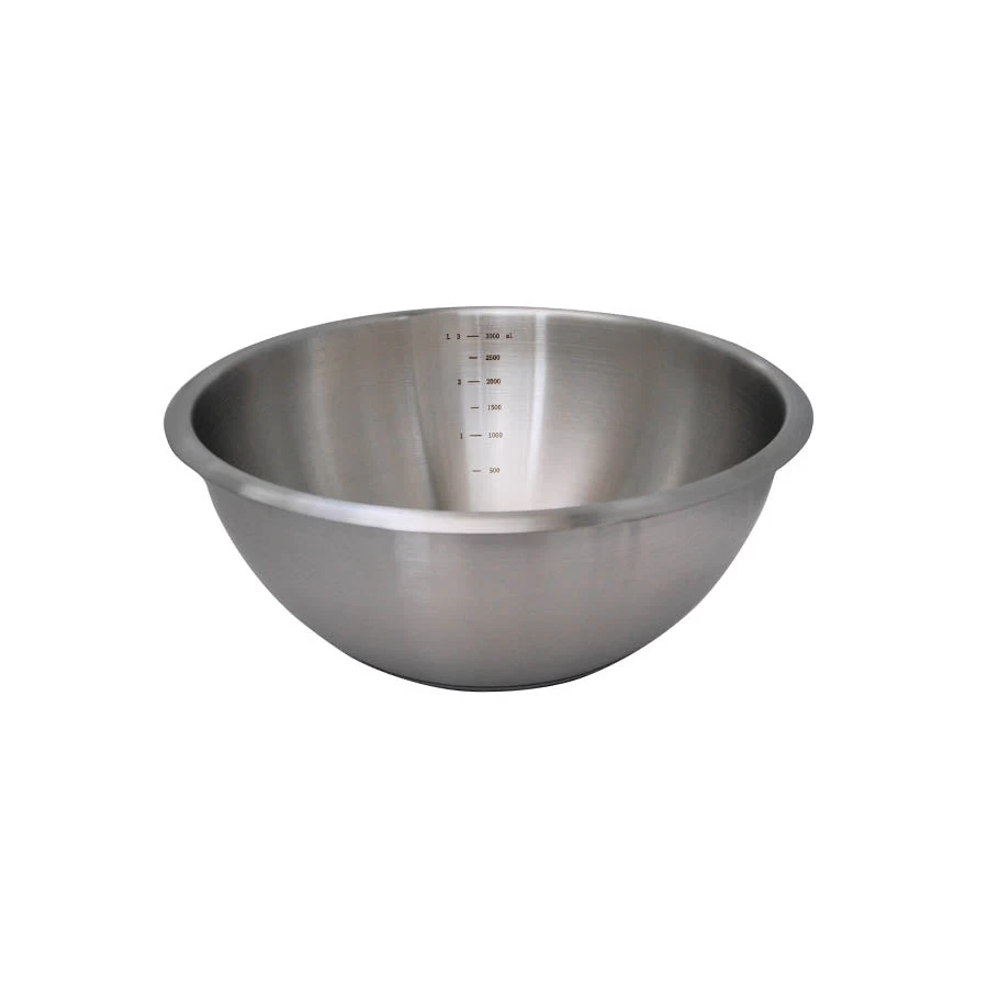 The De Buyer hemisphere mixing bowl is 16cm in diameter and has a capacity of 1 litre. A scale is laser-engraved on the inside, so you can see at a glance the volume of ingredients or mixture in the bowl.