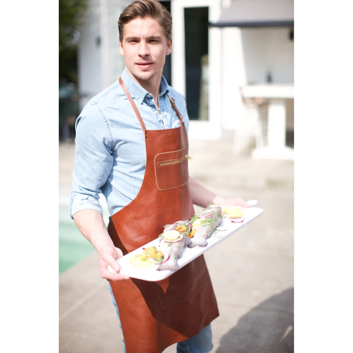 The Dutchdeluxes leather zipper apron in classic brown is so stylish and comfortable, you may never want to take it off. The mahogany-coloured leather seems to have its own inner glow and will make even a quick mid-week dinner feel like a special occasion.