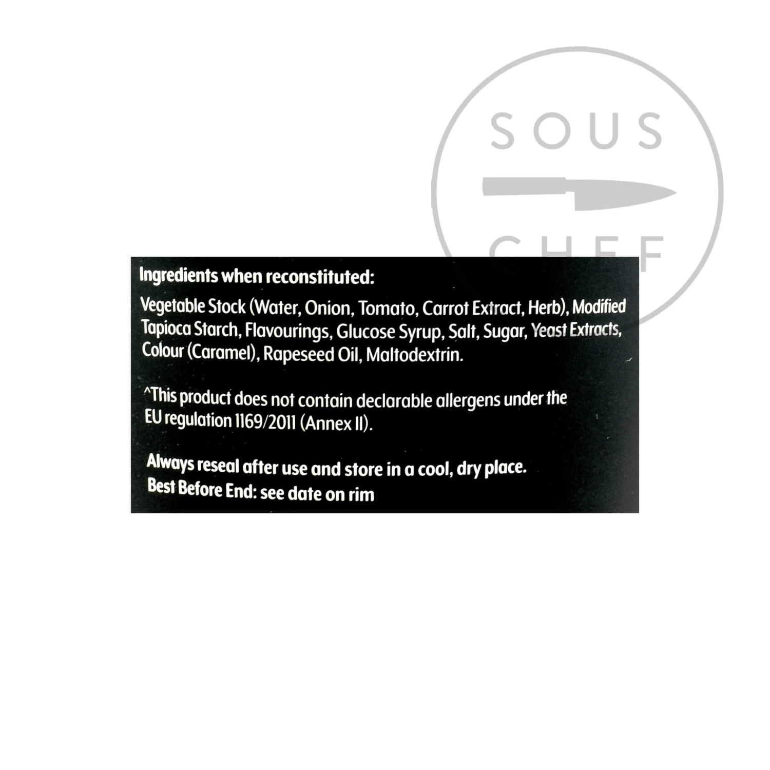 Ingredients: Vegetable stock (water, onion, tomato, carrot extract, herb), modified tapioca starch, flavourings, glucose syrup, yeast extracts, colour (caramel) rapeseed oil, maltodextrin.
