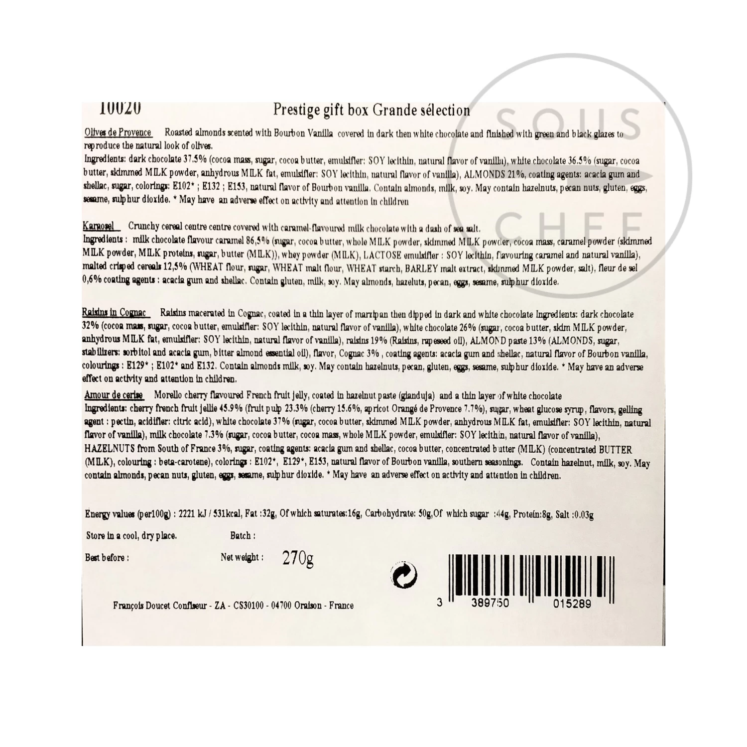 Ingredients: Olives of Provence: 37.5% Dark chocolate (cocoa paste, sugar, cocoa butter, emulsifier: soya lecithin, natural vanilla flavour), 36.5% white chocolate (sugar, cocoa butter, skimmed milk powder, anhydrous milk fat, emulsifier: soya lecithin, natural vanilla flavour), ALMONDS 21%, coating agents: acacia gum and shellac, sugar, colorants: E102 *; E132; E153, natural aroma of Bourbon vanilla. Cherry Love: 42.7% White chocolate (sugar, cocoa butter, skim milk powder, anhydrous milk fat, emulsifier: soya lecithin, natural vanilla flavour), cherry fruit paste 42.6% (fruit pulp 23 % (cherry 16%, apricot Orangé de Provence 7%), sugar, wheat glucose syrup, flavourings, gelling agent: pectin, acidifier: citric acid), milk chocolate 6.7% (sugar, cocoa butter, sugar paste) cocoa, MILK whole powder, emulsifier: soya lecithin, natural vanilla flavour), nuts from the South of France 3%, sugar, cocoa butter, coating agents: acacia gum and shellac, butter (milk) concentrated butter (milk) concentrate, colouring: beta-carotene), colouring: E102 *, E129 *, E153, natural Bourbon vanilla flavour, Provence herbs .Cognac Grapes: 32% Dark chocolate (cocoa mass, sugar, cocoa butter, emulsifier: soya lecithin, natural vanilla flavour), 26% white chocolate (sugar, cocoa butter, skimmed milk powder, anhydrous milk fat, emulsifier: soya lecithin, natural vanilla flavour), raisins 19% (grapes, rapeseed oil), almond paste 13% (almonds, sugar, stabilizers: sorbitol and acacia gum, bitter almond essential oil ), aroma, Cognac 3%, coating agents: acacia gum and shellac, natural Bourbon vanilla flavour, colors: E129 *; E102 *; E132. Karaosel: caramel flavoured milk chocolate 86.5% (sugar, cocoa butter, skimmed milk powder, cocoa mass, caramel powder (milk skimmed powder, milk protein, sugar, butter (milk )), whey in powder (milk ), lactose, emulsifier: soya lecithin, caramel flavour and natural vanilla), crumbly malted cereals 12.5% (BLE flour, sugar, malted wheat flour, BLE starch, barley malt extract, skim milk, salt), fleur de sel 0.6%, coating agents: acacia gum and shellac.