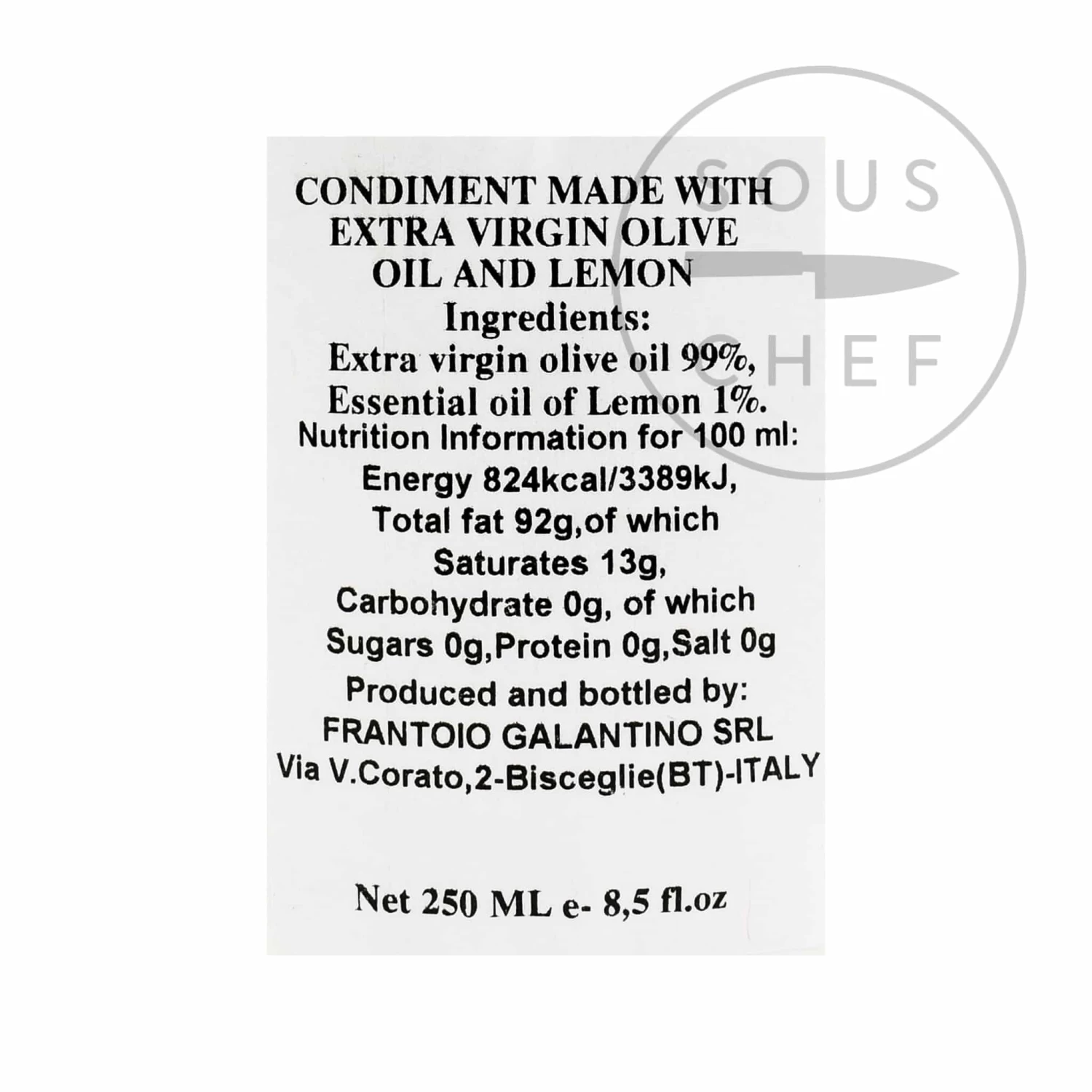 Ingredients: extra virgin olive oil (99%), essential oil of lemon (1%).