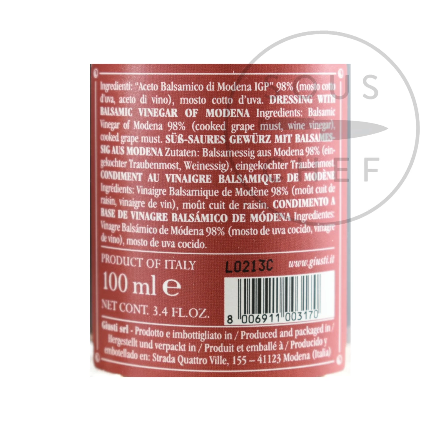 Ingredients: Balsamic vinegar of Modena 98% (cooked grape must, wine vinegar), cooked grape must. Contains sulphites.