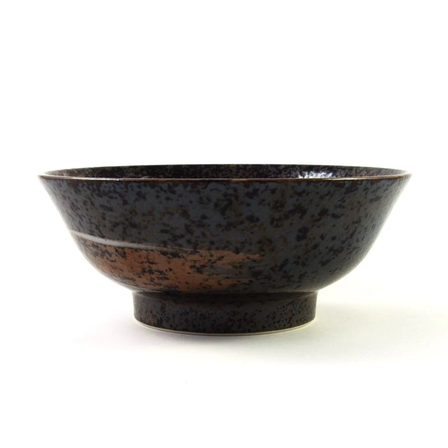 “Karasuba-iro” means glossy black in Japanese, and this glazed ceramic ramen bowl, has a beautiful glossy black and grey speckled surface. Additional red-brown detailing, and white sweeps add to the elegance of the design. This shape and size of Japanese bowl is perfect for serving noodle or ramen dishes.