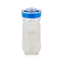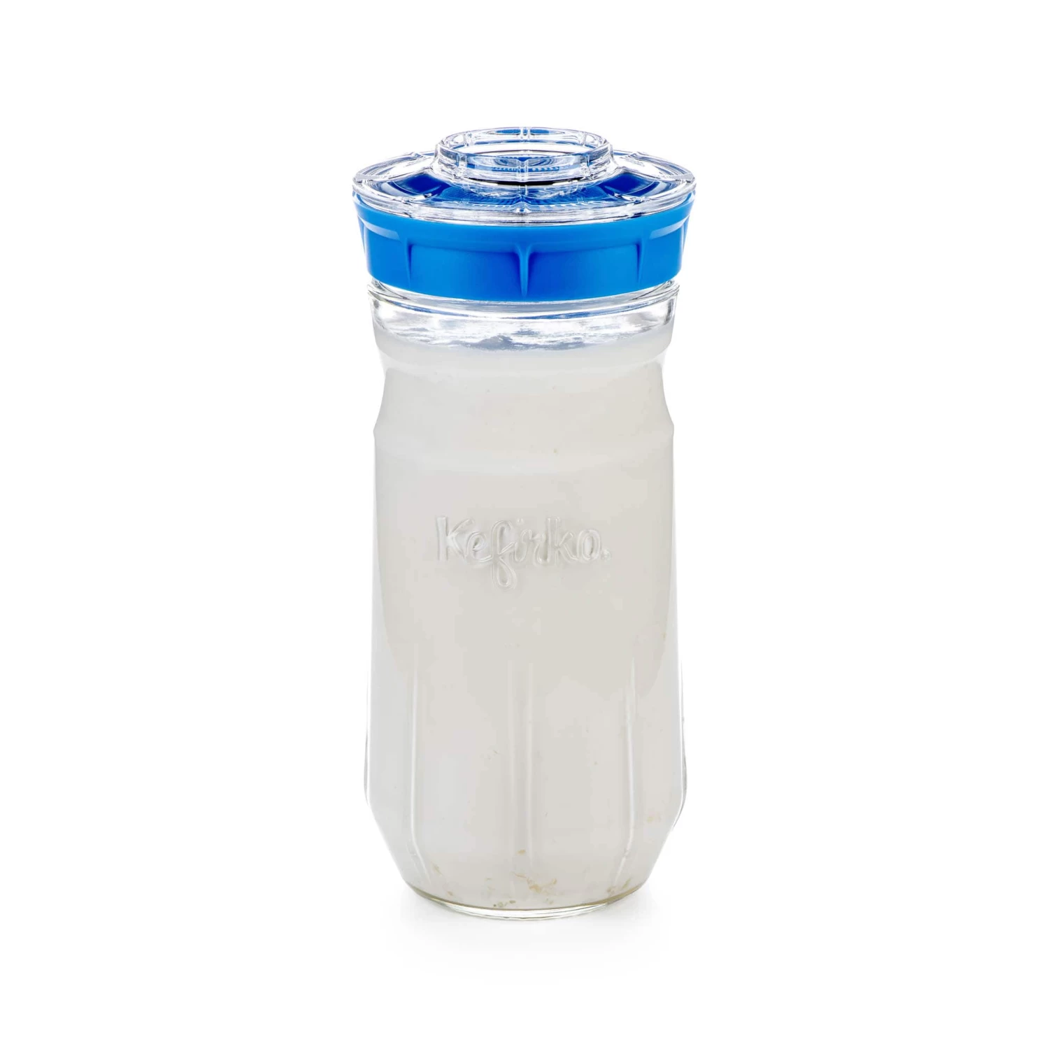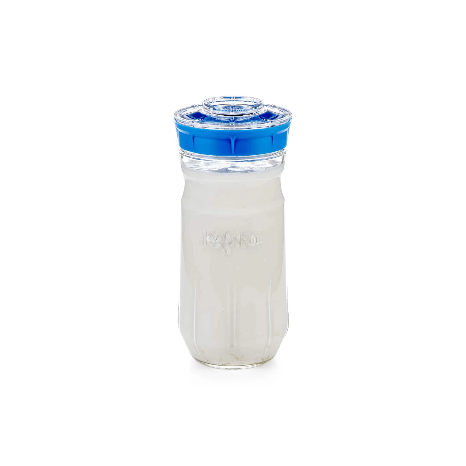 The two-piece lid is designed for optimal airflow during the fermentation process, while also blocking impurities such as dust. A strainer lid features two sizes of slots – one for milk, one for water – so you can sip your kefir thick or thin.