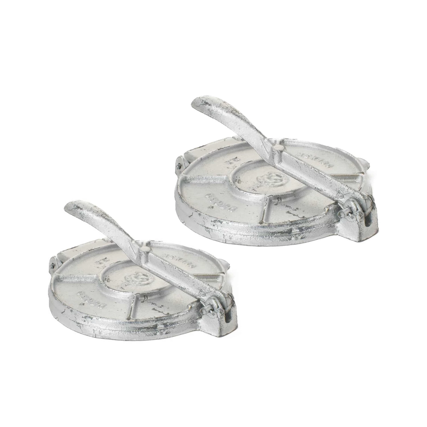 Note: This is an authentic Mexican tortilla press, so the silver finish is not permanent. It is a protective layer to protect from rust and may be prone to wear over time. This does not affect the quality or performance of the product. Use two sheets of plastic film or baking paper on either plate when pressing out the tortillas. When the product arrives, the dimension on the label of the exterior box indicates the size of tortilla it will make.