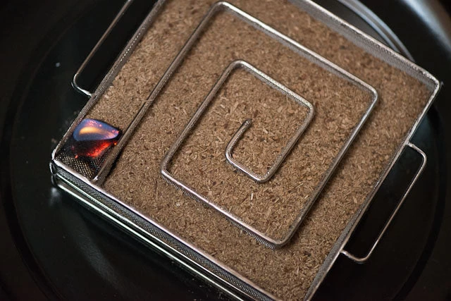 Next, fill the smoking tray with the oak wood dust, and light the corner using a candle – after a minute or so, once the dust starts to smoulder, remove the candle and blow out. The smoke will wind its way through the maze over the course of ten hours, releasing a steady stream of smoke. Add spices or herbs, or use different flavoured wood dust to scent the smoke and pair it with specific foods. Try everything from haddock, to home-smoked salmon, bacon, brisket, ribs and cheeses.