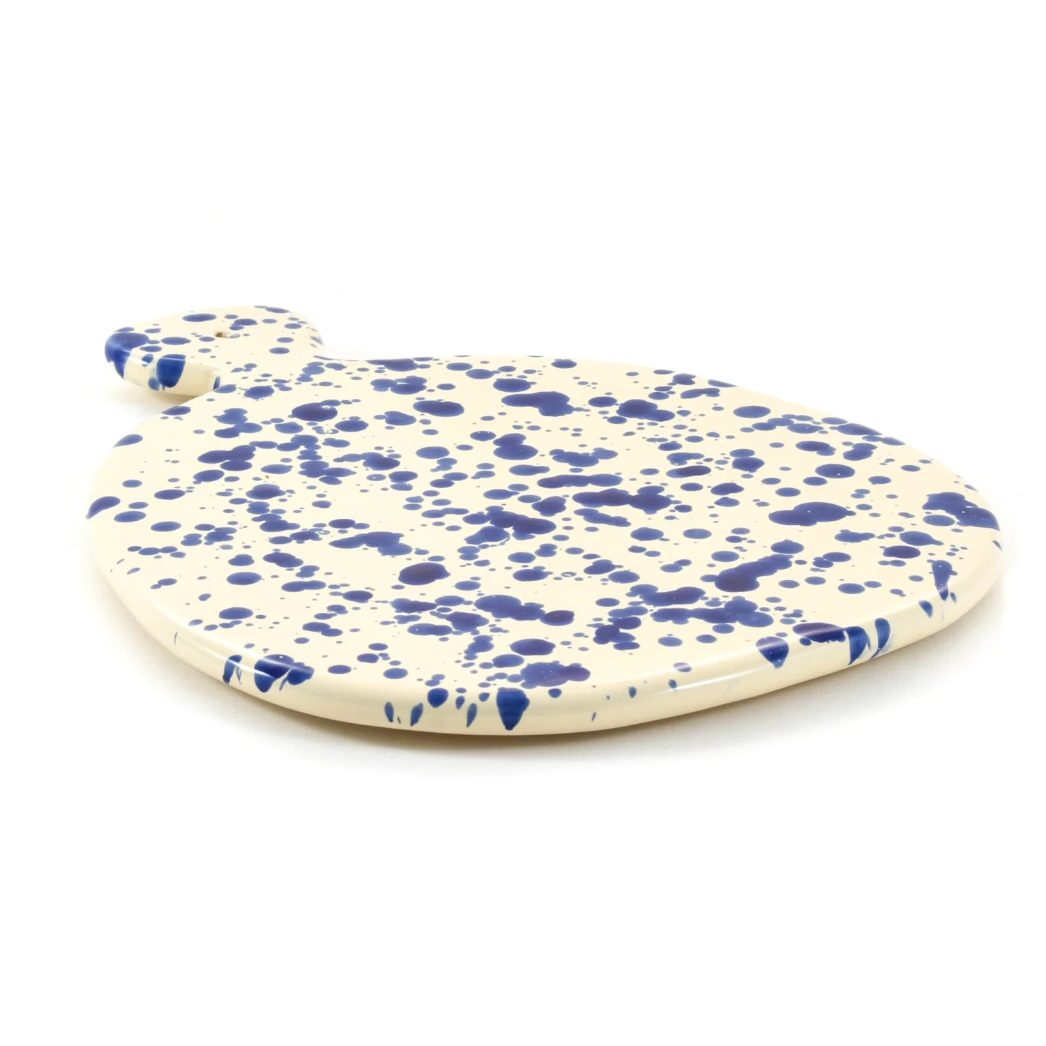 The off-white ceramic platter is decorated with splashes of blue, giving an artist’s palette vibe to this piece of crockery.