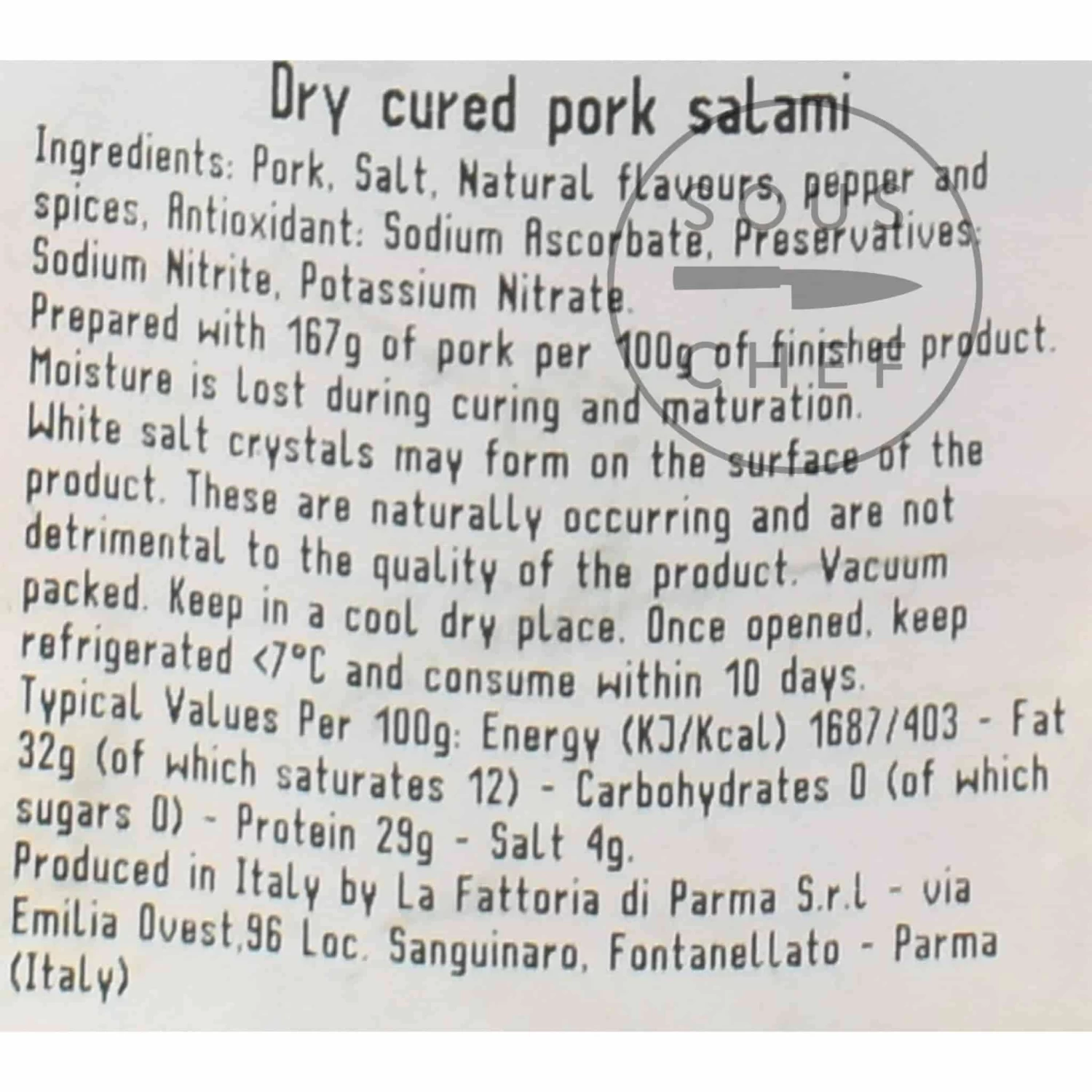 Salami Felino IGP Riserva is made by La Fattoria di Parma, a family-owned company in rural northern Italy. This dry-cured pork salami is prepared with 167g of pork per 100g of finished product, and is simply flavoured with salt, pepper and spices.